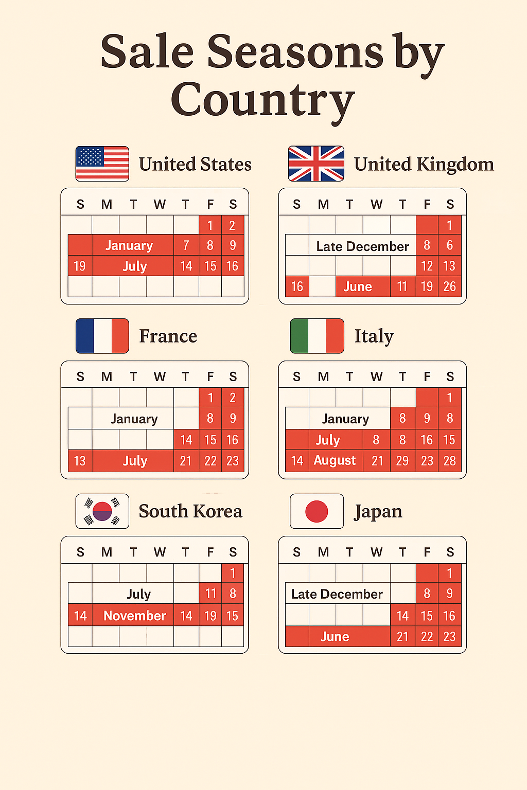 🗓 2. 절대 놓치지 말아야 할 세일 시즌 – 국가별 핵심 요약
